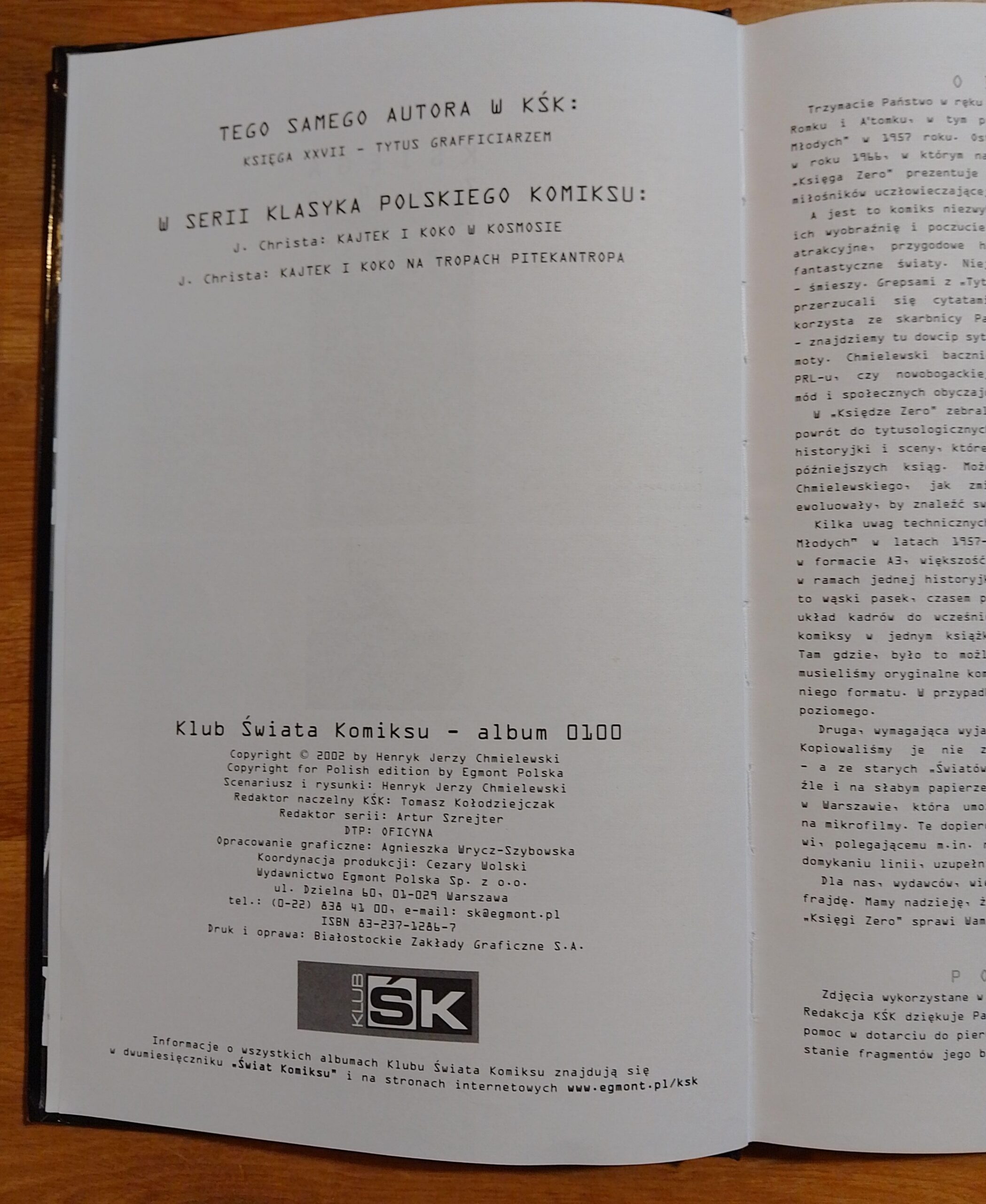 Jubileuszowa, setna pozycja w Klubie Świata Komiksu wydawnictwa Egmont, to prawdziwa gratka dla zbieraczy – wybór najstarszych historyjek o Tytusie! Publikowane były na łamach „Świata Młodych” w latach 1957-1966 i doczekały się wznowienia dopiero w niniejszym wydaniu. Widać dzięki nim, że komiksy Papcia Chmiela od samego początku były skarbnicą niesamowitych pomysłów, przez co nie bez powodu stały się klasyką polskiego komiksu fantastycznego.